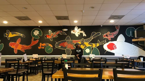 I worked again with the familiar client and owner of Kanpai 2 in December of 2019 to modernise their main dining room wall with a graphic Japanese koi fish pond. I worked with house paint and accented with gold foil. If you’re ever in Savannah, Georgia, check it out at Kanpai, Chatham Parkway and eat some great Japanese food.